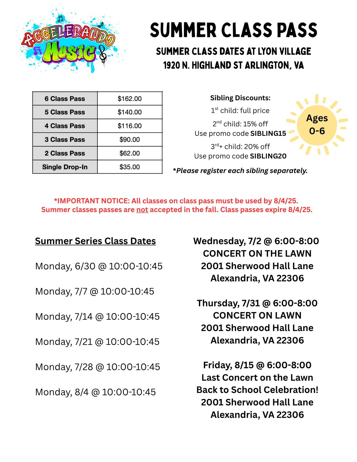 To join our summer fun, you can purchase a class pass, which will operate like a “punch card”. The more classes you purchase on your pass, the more you save.